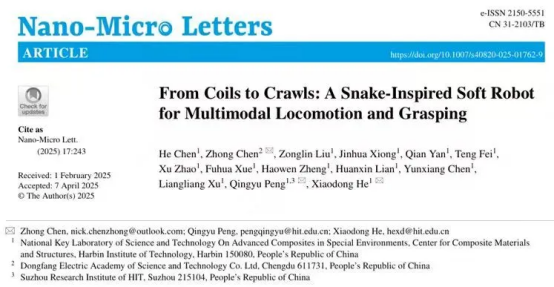 相关成果以《From Coils to Crawls: A Snake-Inspired Soft Robot for Multimodal Locomotion and Grasping》为题,东方研究院陈仲博士与哈尔滨工业大学赫晓东院士、彭庆宇教授为共同通讯作者。
