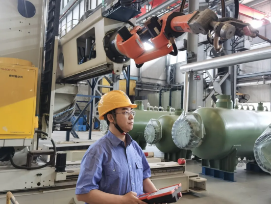 随着“嗞”的电流声响起,焊枪缓缓移动,生产制造部焊接骨干刘庆眉头逐渐紧锁,高度紧张,眼神紧盯焊点,手握机械臂操控柄,挪着小碎步精细操作,完全顾不上自己踩在超150℃高温的十米高的操作台上。